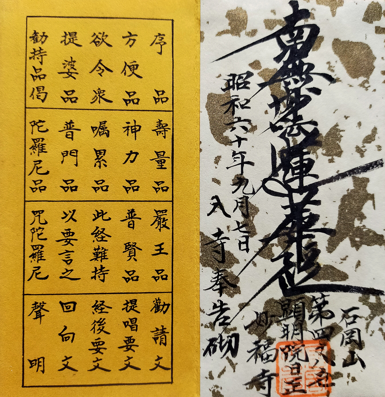 最初のページに、お弟子さまへお題目をお書き添えて頂く、金縁に彩られた天金の要品は、特におめでたい入寺の節目などにお配り頂くのにお勧めです。